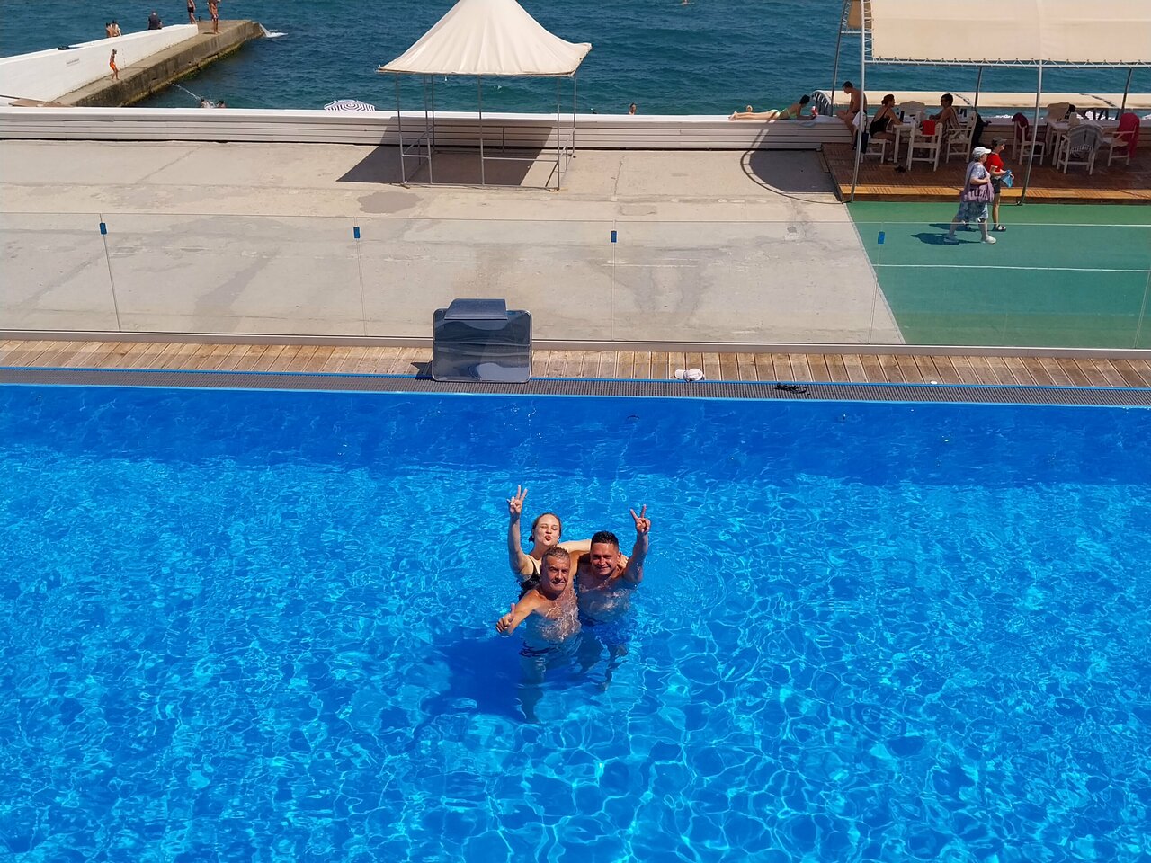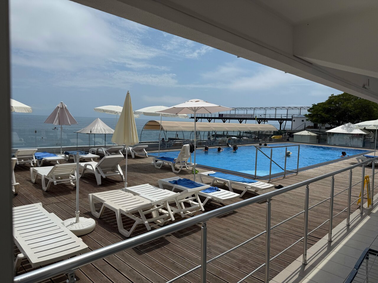 Очень нравится наличие бассейна и первая линия. Отличное место, где можно спокойно отдохнуть и много поплавать. Из особенностей: в номере на первом этаже с видом на бассейн и в стандартном номере на первом этаже (возможно и в остальных) нет питьевой воды. Висят таблички, что из под крана вода проверена и она питьевая. В холле есть кулер. Хорошие завтраки в кафе (шведский стол). Обеды за расчет в формате кафе, готовят вкусно. На фото вид из кафе.
