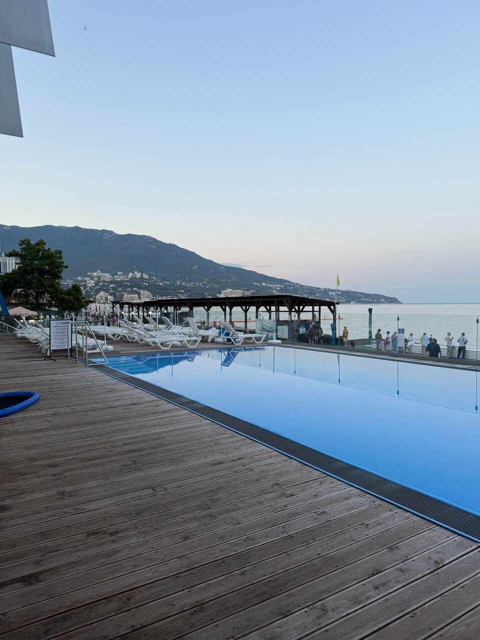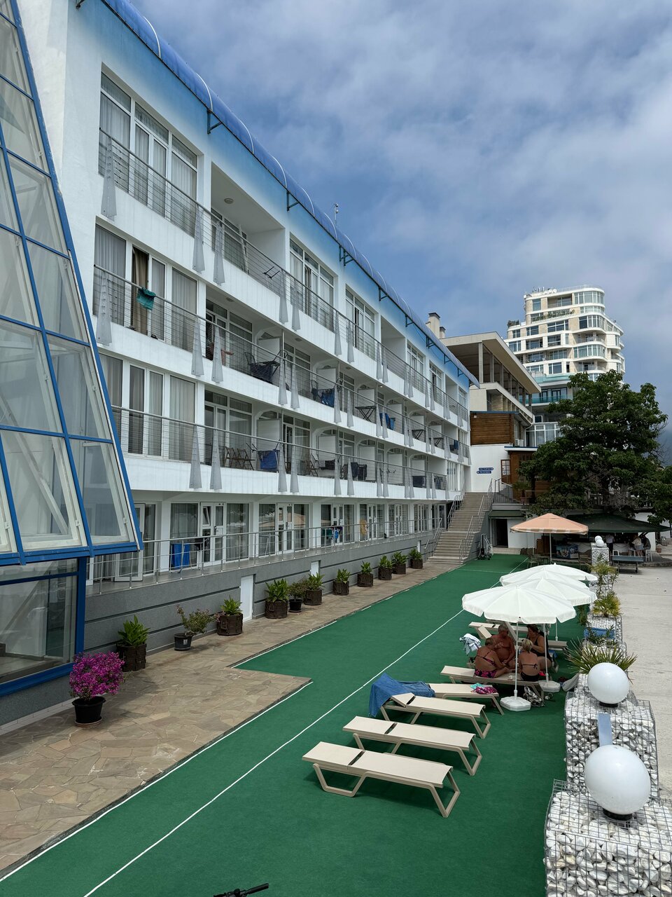 Отдыхали в июле 2025 года, очень понравилось! Есть плюсы (их множество), есть и небольшие замечания) Плюсы: 1.Заселение: мы приехали раньше положенного времени, но наш номер был уже готов, заселили без проблем! Очень быстрая процедура оформления, приветливые сотрудники на ресепшн, всё очень вежливо, с улыбкой. 2.Номер: у нас был номер Люкс на 4-м этаже – уютно, просторно, 2 подушки на человека – отдельное большое спасибо! Шторы «блэкаут» - отдельное огромное спасибо! Отдыхали втроем, и диван во второй комнате уже был застелен к нашему заселению – прекрасно, можно было сразу отдохнуть после дороги! В номере необходимый минимум гигиенических средств, чайная станция. 3.Уборка – качественно, аккуратно. Смена постельного, полотенец – нет вопросов! Пляжные полотенца меняли чуть не 2 раза в день! 4.Питание: завтраки отличные, качество продуктов хорошее, разнообразно, вкусно! Большой плюс – очень приветливый администратор при входе на завтрак, в первый день всё показала, каждый день – улыбка и пожелание доброго утра, это очень приятно) В день рождения супруга на завтрак принесли бутылку игристого и бокалы, что сразу задало праздничное настроение) 5.Территория: ну ее особо нет, со стороны моря – бассейн и всё. Очень порадовало место для курения – находится позади здания, всегда тень, сосны, красивейшие цветы – прекрасно! Бассейн чистый, теплый, лежаков достаточно возле него. 6.Пляж: есть лежаки и зонтики, посторонних мы особо не видели, только проживающие (потом встречались у бассейна, на завтраках, поэтому знаем, что это «наши»)) 7.Ресторан: ходили пару раз обедать – очень прилично всё, понравилась забота официанта о порядке выноса блюд: пока наш ребенок не доел основное блюдо, мороженое ему не приносили)) Перекусывали и в барной зоне, рядом с пляжем – обслуживание быстрое, с улыбкой, официант Анастасия – прелесть) 8.Расположение: просто замечательное – море буквально в двух шагах, вид из окна – роскошный, совершенно потрясающий! С другой стороны отеля – прекрасный парк. Центральная набережная недалеко, рядом магазин Пуд (супермаркет с хорошим ассортиментом). 9.Отдельным плюсом – парковочное место!! Рядом со входом в отель!! Невероятная роскошь для Ялты) Ну и немного замечаний: 1.При заезде в первый раз не очень понятно где в принципе вход на территорию отеля, большой указатель висит, что на пляж прохода нет, калитка входа – совсем незаметная, охранник в будочке не торопится помочь совершенно! 2. Уже писали в отзывах про мебель на балконе – совсем небольшой столик добавил бы много комфорта! 3.Гладильные доски и утюги на этажах: обновите, пожалуйста! Доска продавленная, утюг слабенький, а все хотят быть красивыми) Итог: обязательно вернемся в следующем году уже всей семьей, и будем рекомендовать друзьям)